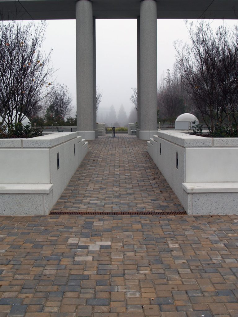 The Legacy Paver Group removed all the existing bricks and stones, then returned to install the pavers after the new waterproofing had been installed and tested. The biggest challenge here was getting all the materials up to the second and third stories, all while being careful not to disturb the beloved geese who live in the gardens all around the campus.